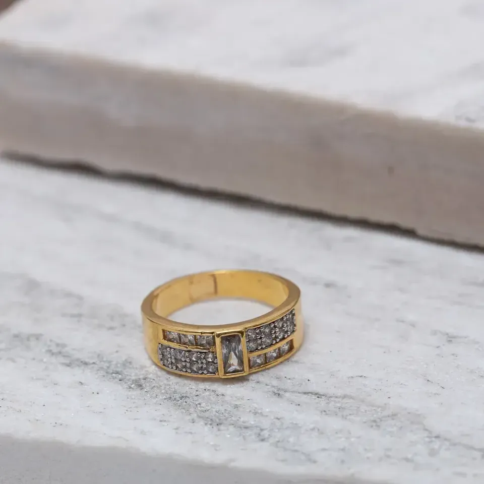 ANEL COM ZIRCÔNIAS CRISTAIS QUADRADAS BANHO OURO18K