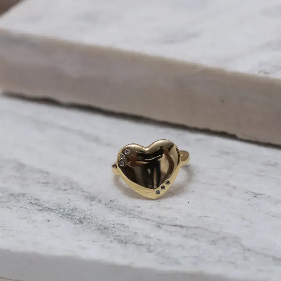 ANEL CORAÇÃO GRANDE COM 6 ZIRCÔNIAS BANHO OURO 18K