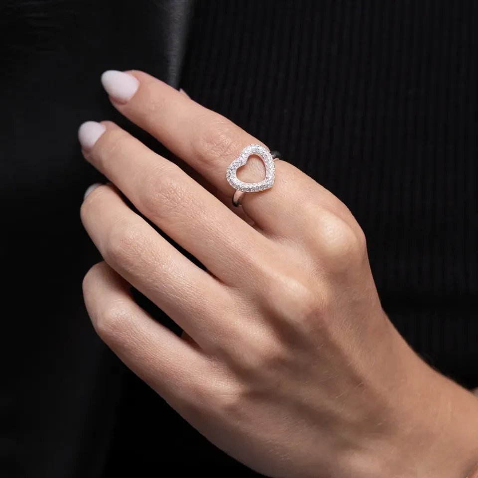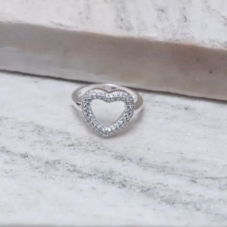 ANEL CORAÇÃO VAZADO CRAVEJADO CRISTAL BANHO PRATA