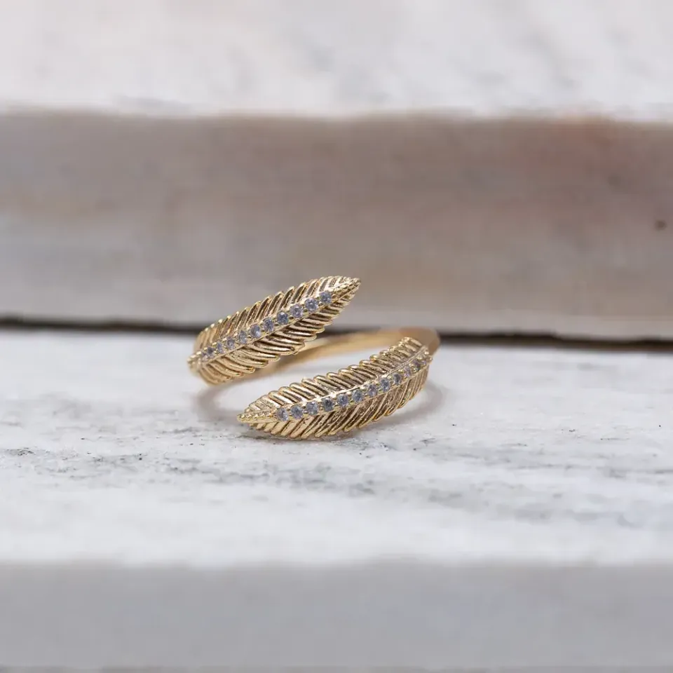 ANEL FOLHA COM ZIRCÔNIAS CRISTAIS REGULÁVEL BANHO OURO 18K