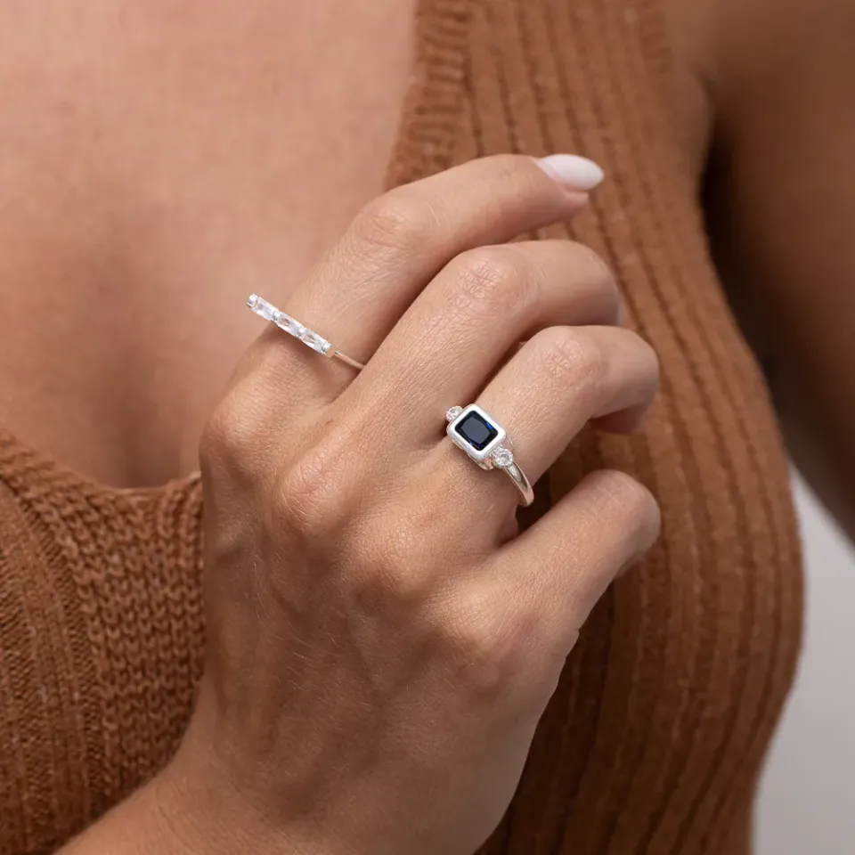 Anel Quadrado com Pedra Azul Marinho em banho Prata