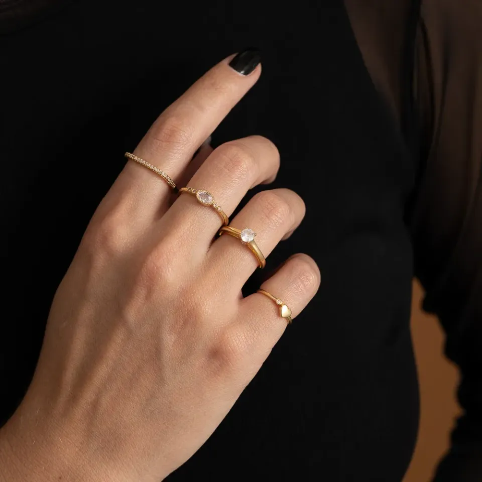 ANEL QUADRADO FINO CRAVEJADO COM ZIRCÔNIAS CRISTAIS BANHO OURO 18K