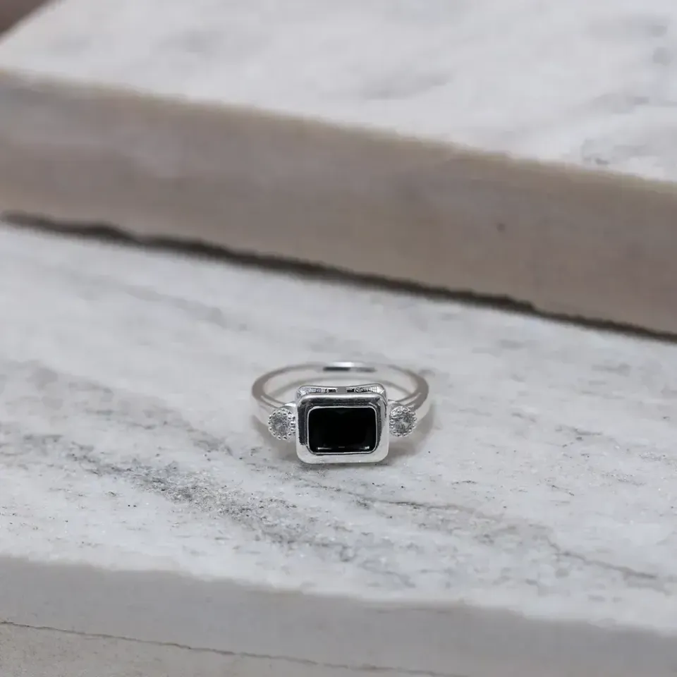 ANEL QUADRADO COM PEDRA NEGRA BANHO PRATA