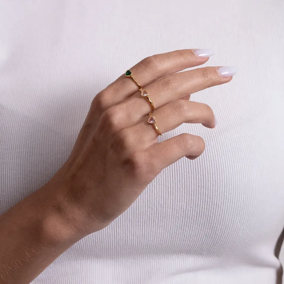 Anel Regulável Coração Pedra Verde Esmeralda em banho Ouro 18K
