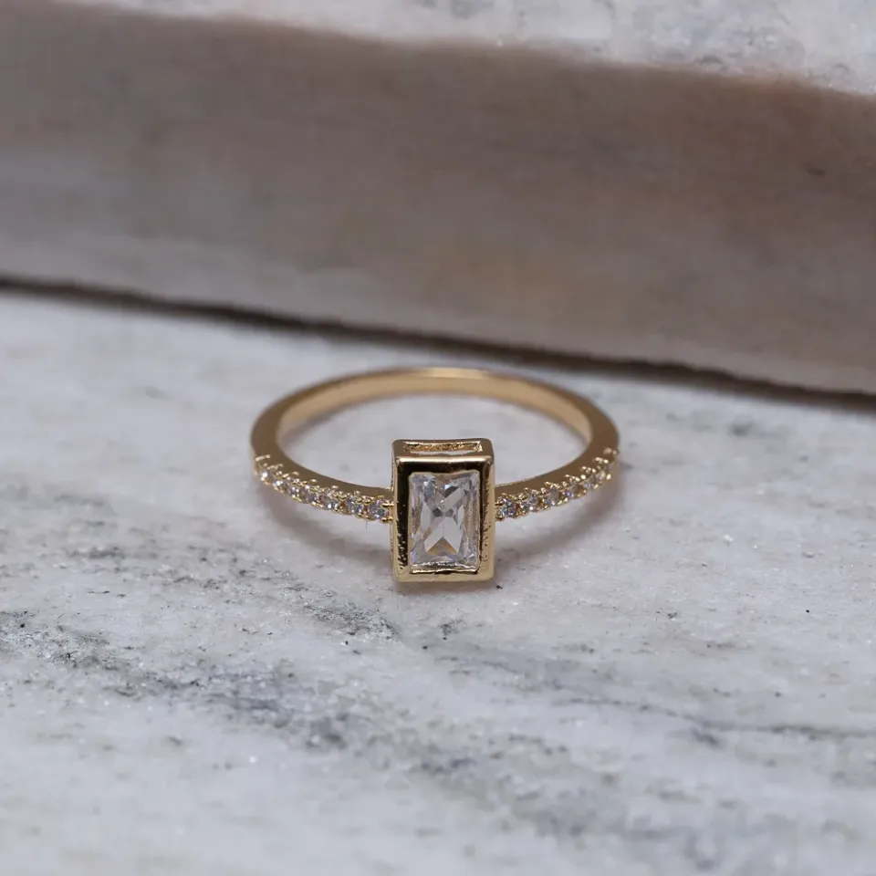 ANEL SOLITÁRIO RETÂNGULO CRAVEJADO BANHO OURO 18K