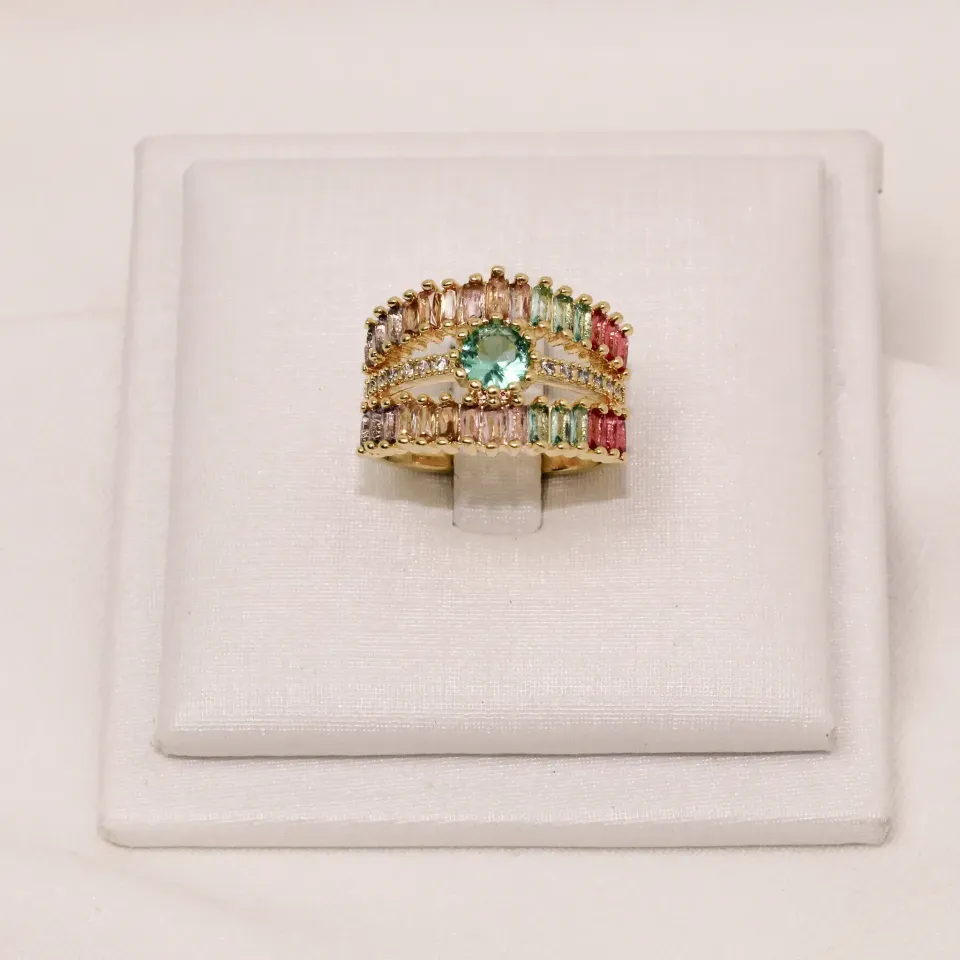ANEL TRIPLO CRAVEJADO COM ZIRCÔNIAS COLORIDAS BANHO OURO 18K