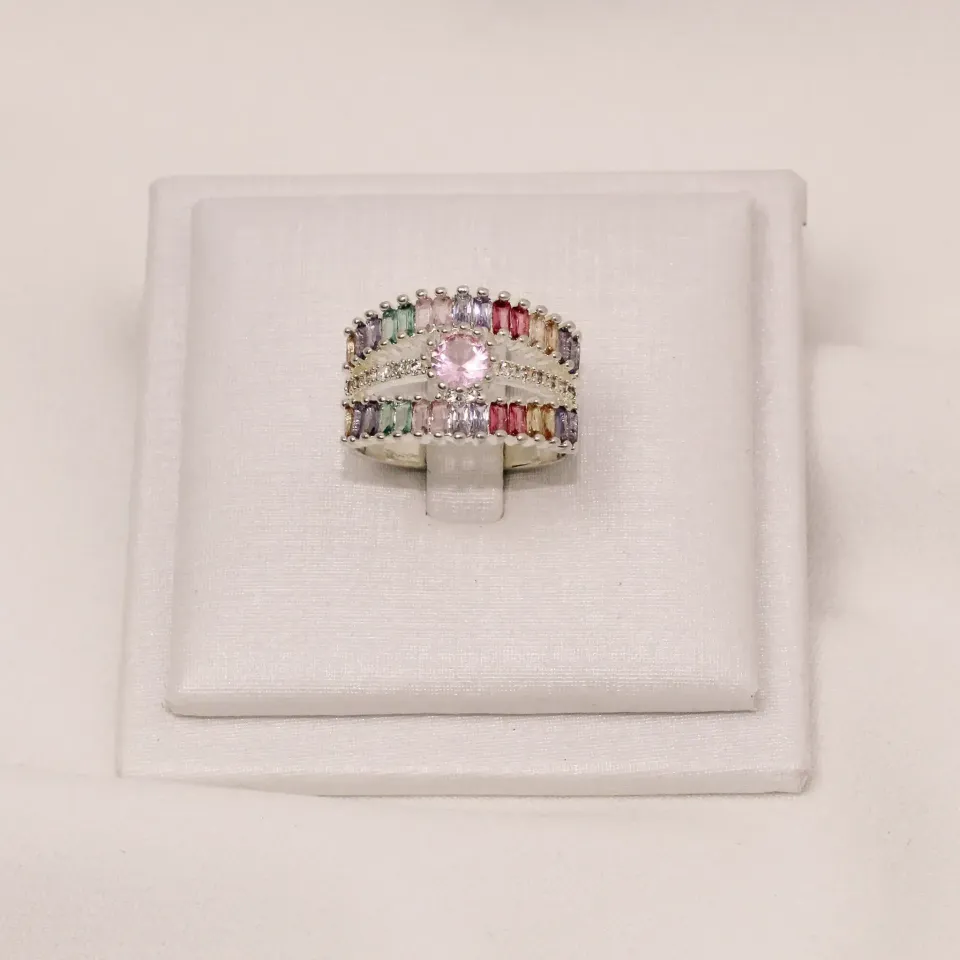 ANEL TRIPLO CRAVEJADO COM ZIRCÔNIAS COLORIDAS BANHO PRATA