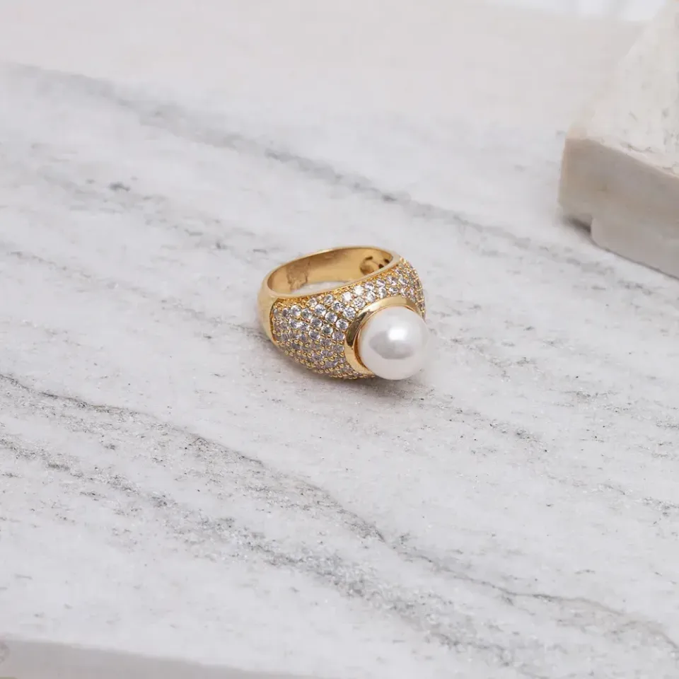 ANEL CRAVEJADO COM ZIRCÔNIAS CRISTAIS E PERÓLA BANHO OURO 18K