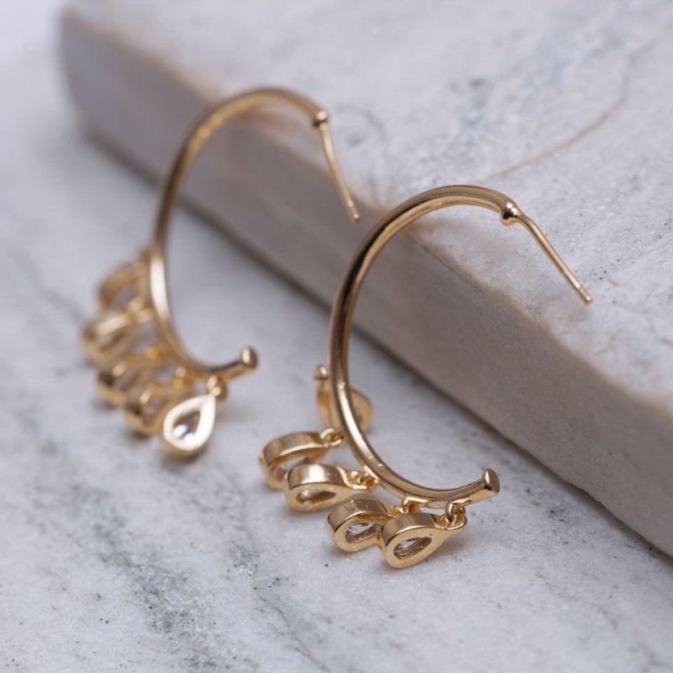 BRINCO ARGOLA PINGENTES GOTAS CRISTAIS BANHO OURO 18K