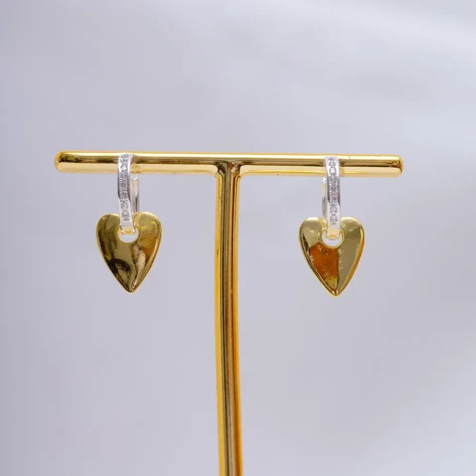 BRINCO ARGOLA DOIS BANHOS CRAVEJADO COM ZIRCÔNIAS CRISTAIS E CORAÇÃO LISO BANHO PRATA