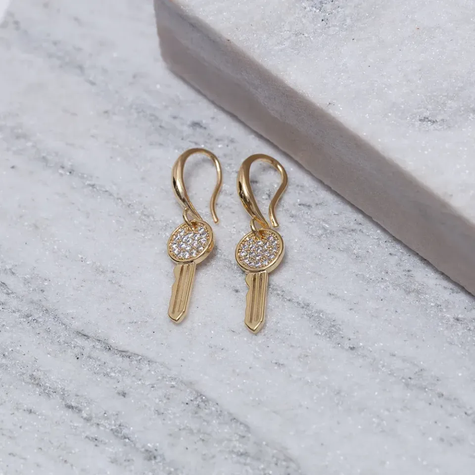 BRINCO ARGOLA PINGENTE CHAVE CRAVEJADA BANHO OURO 18K