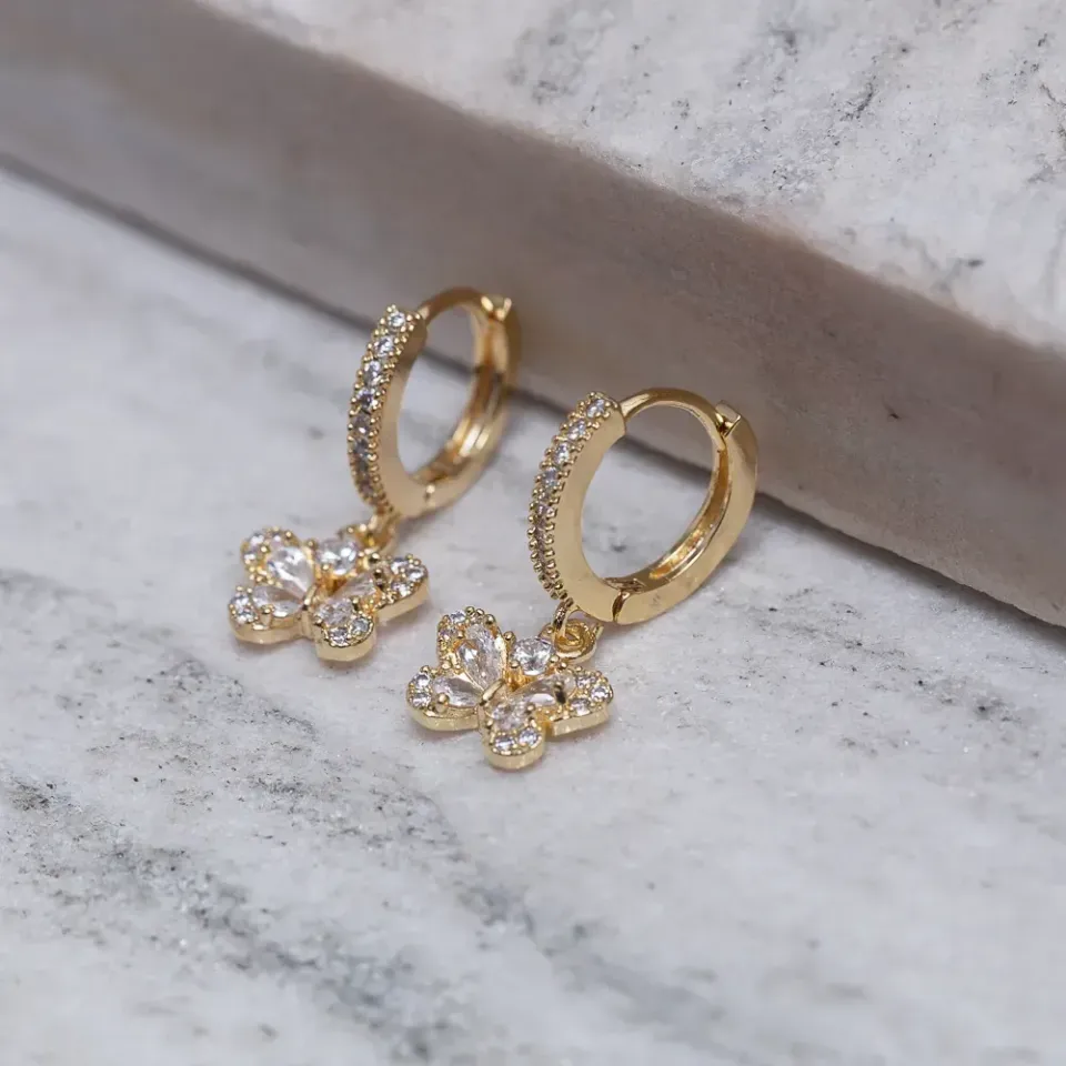 BRINCO ARGOLINHA BORBOLETA CRISTAL BANHO OURO 18K