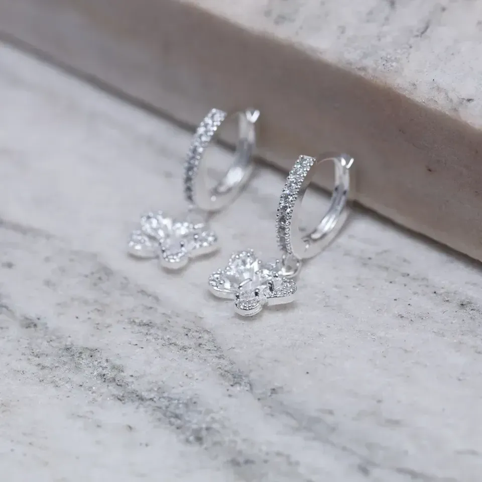 BRINCO ARGOLINHA BORBOLETA CRISTAL BANHO PRATA
