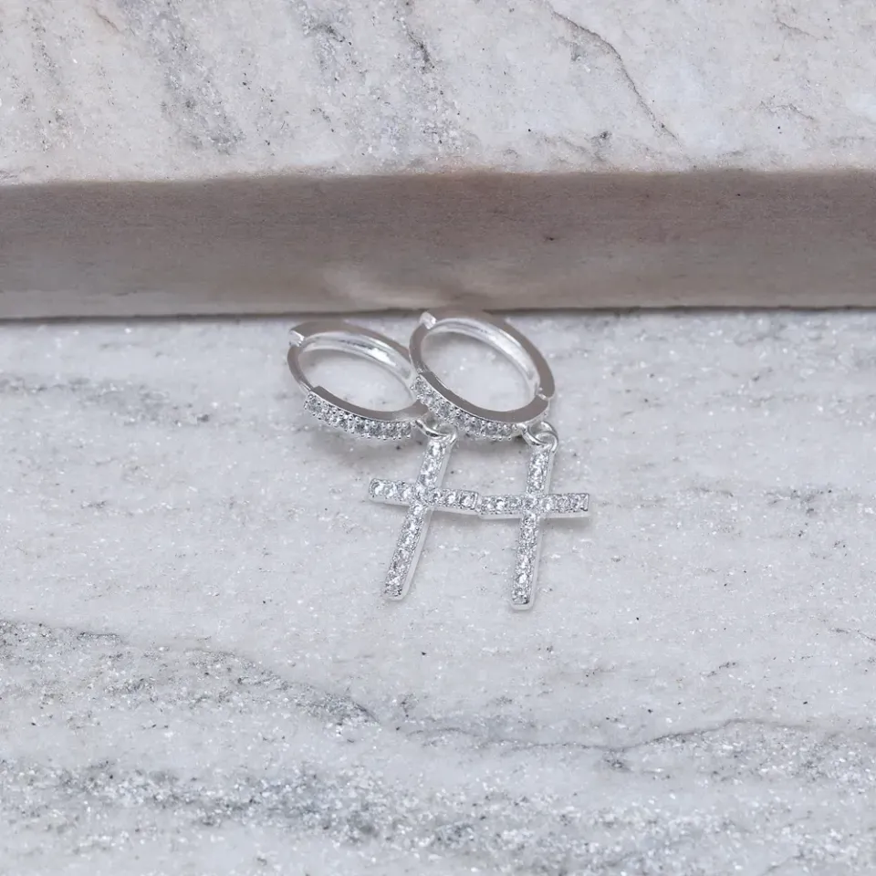 BRINCO ARGOLINHA COM CRUZ CRAVEJADA BANHO PRATA