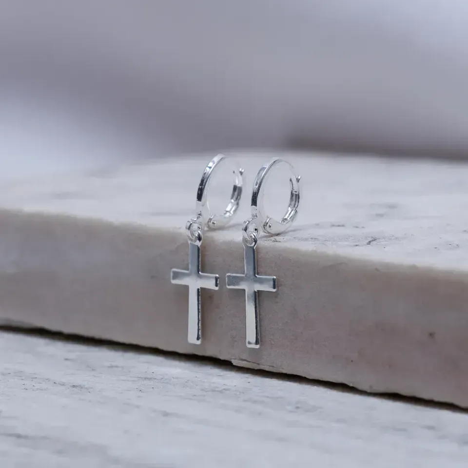 Brinco Argolinha cm Cruz em banho Prata