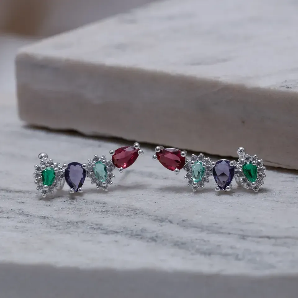 BRINCO EAR CUFF COM PEDRAS COLORIDAS BANHO PRATA