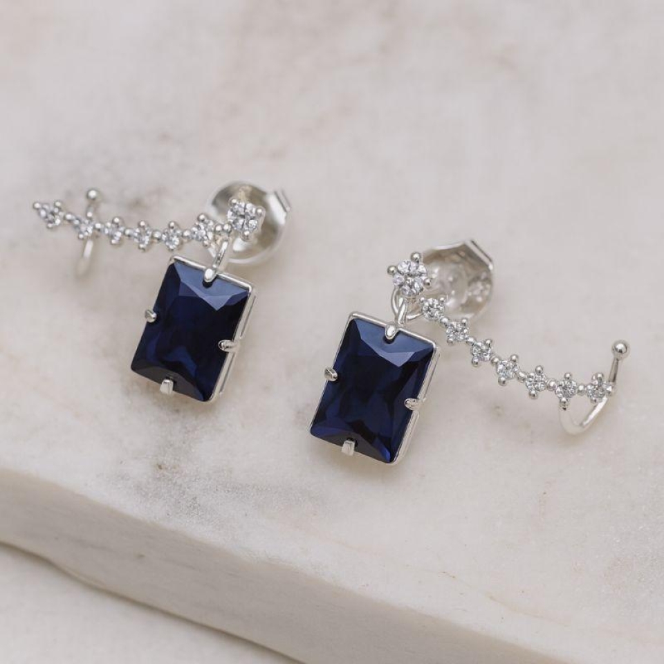 BRINCO EAR CUFF CRAVEJADO COM ZIRCÔNIAS CRISTAIS E PEDRA AZUL ESCURO BANHO PRATA