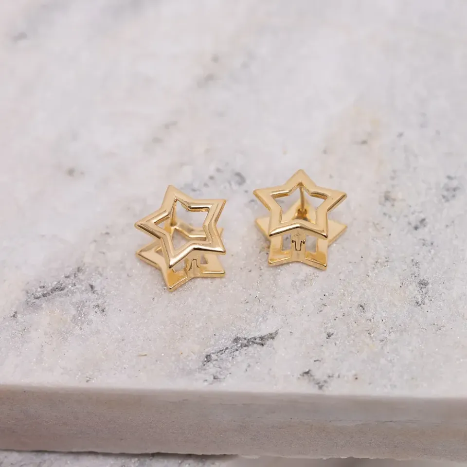 BRINCO ESTRELA DUPLO LISO BANHO OURO 18K