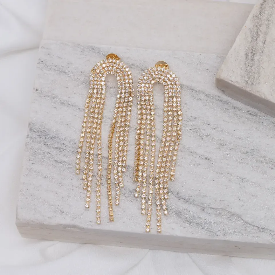 Brinco Festa Franja Arco com Zircônias Cristais em banho Ouro 18K