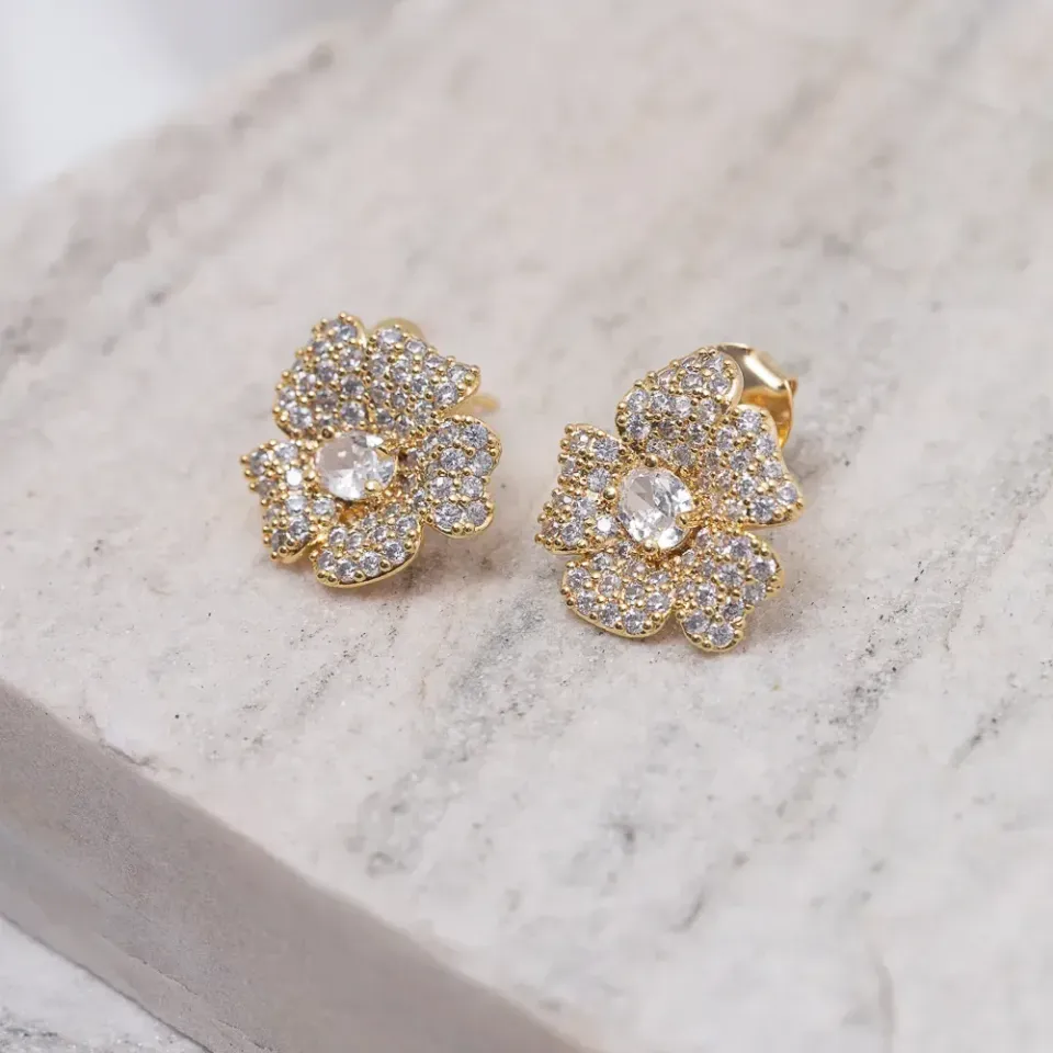 BRINCO FLOR CRAVEJADA COM ZIRCÔNIAS CRISTAIS BANHO OURO 18K