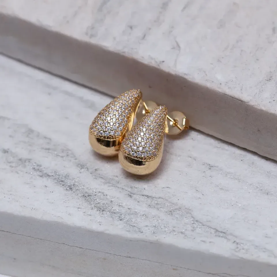 BRINCO GOTA ABAULADA CRAVEJADA BANHO OURO 18K