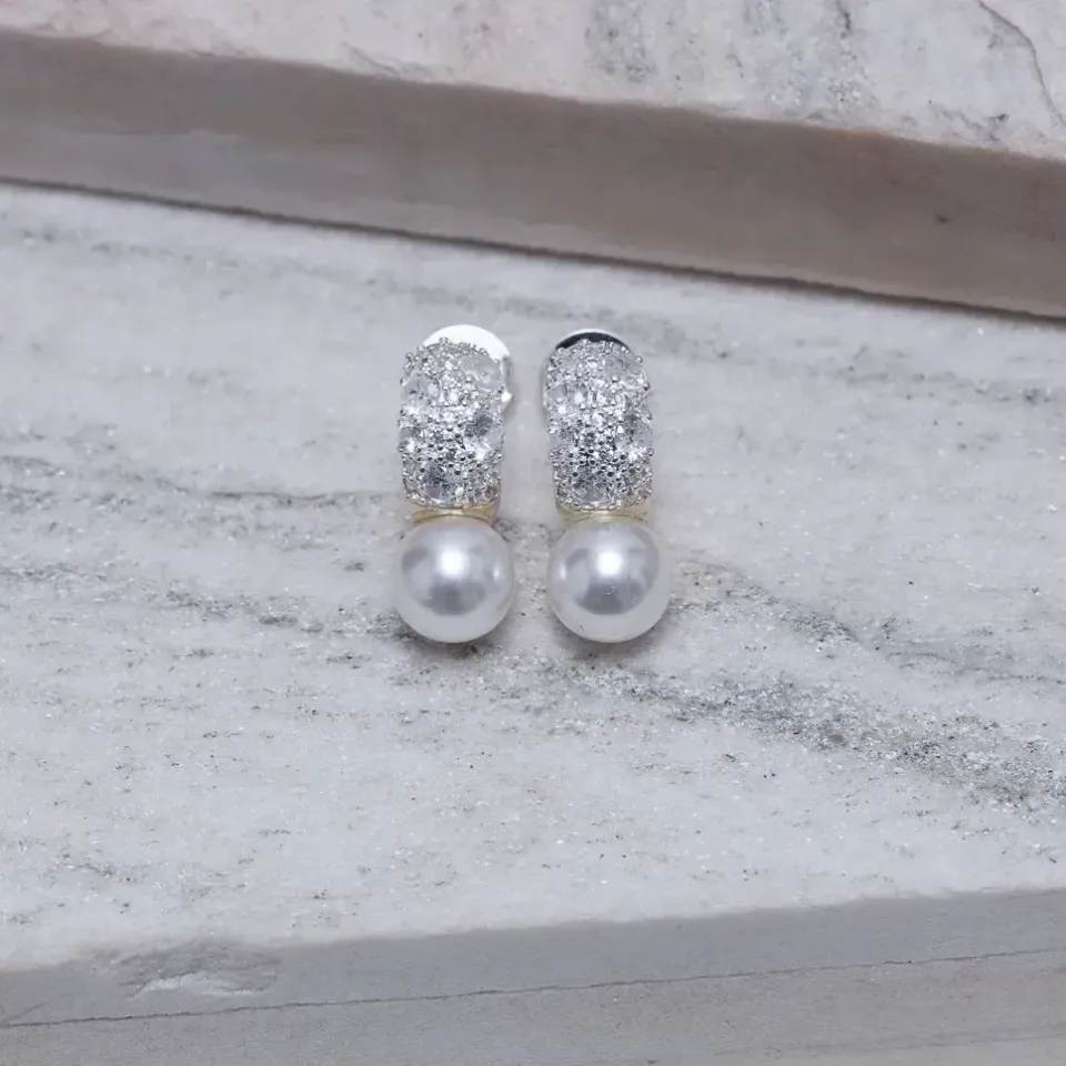 BRINCO GOTA CRAVEJADA COM PÉROLA BANHO PRATA