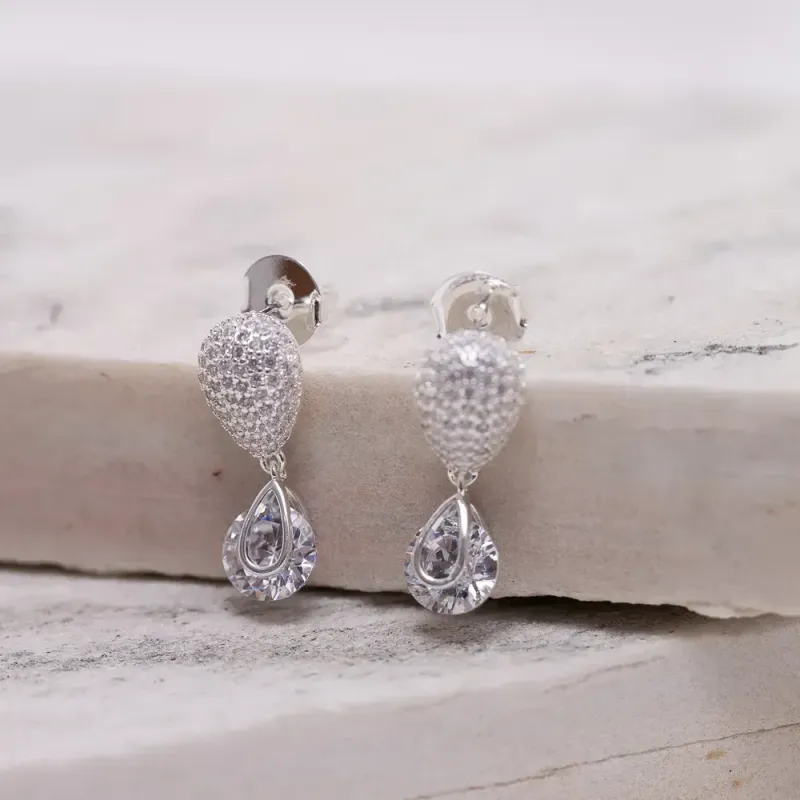 BRINCO GOTA CREVEJADA COM ZIRCÔNIAS CRISTAIS E PONTO DE LUZ BANHO PRATA