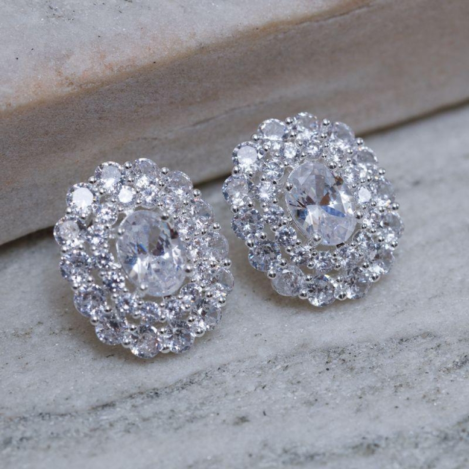 BRINCO OVAL CRAVEJADO CRISTAL BANHO PRATA