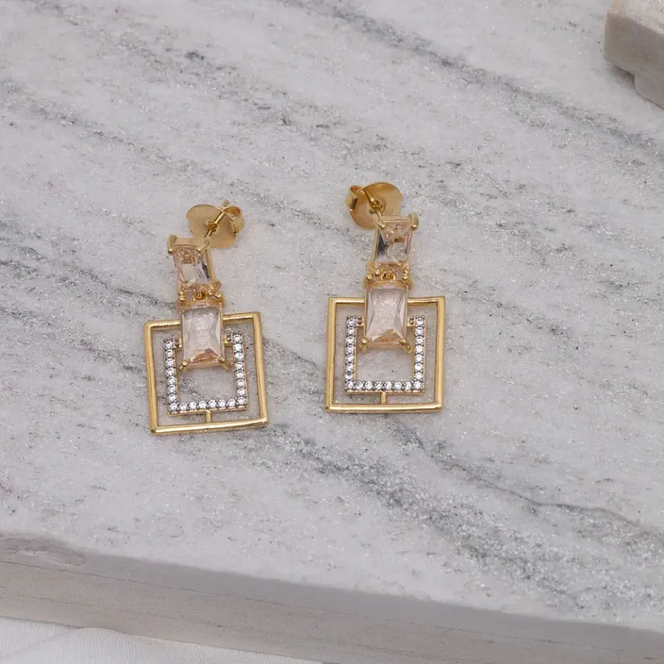 BRINCO QUADRADO COM PEDRA ROSÉ BANHO OURO 18K