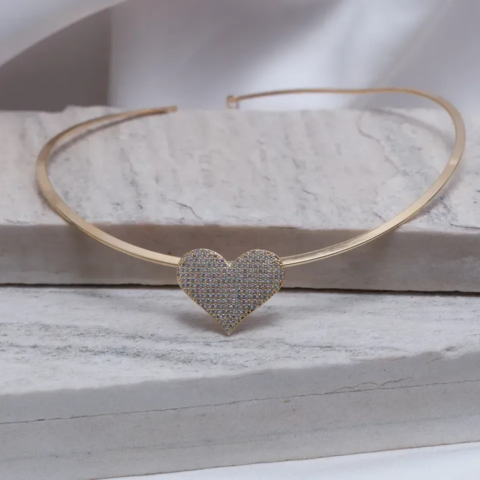 COLAR ARO ACHATADO COM CORAÇÃO CRAVEJADO BANHO OURO 18K