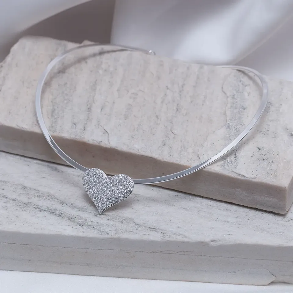 COLAR ARO ACHATADO COM CORAÇÃO CRAVEJADO BANHO PRATA