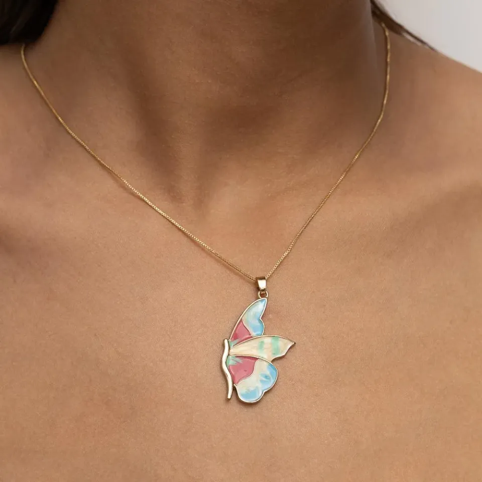 COLAR BORBOLETA ESMALATADA COLORIDA BANHO OURO 18K