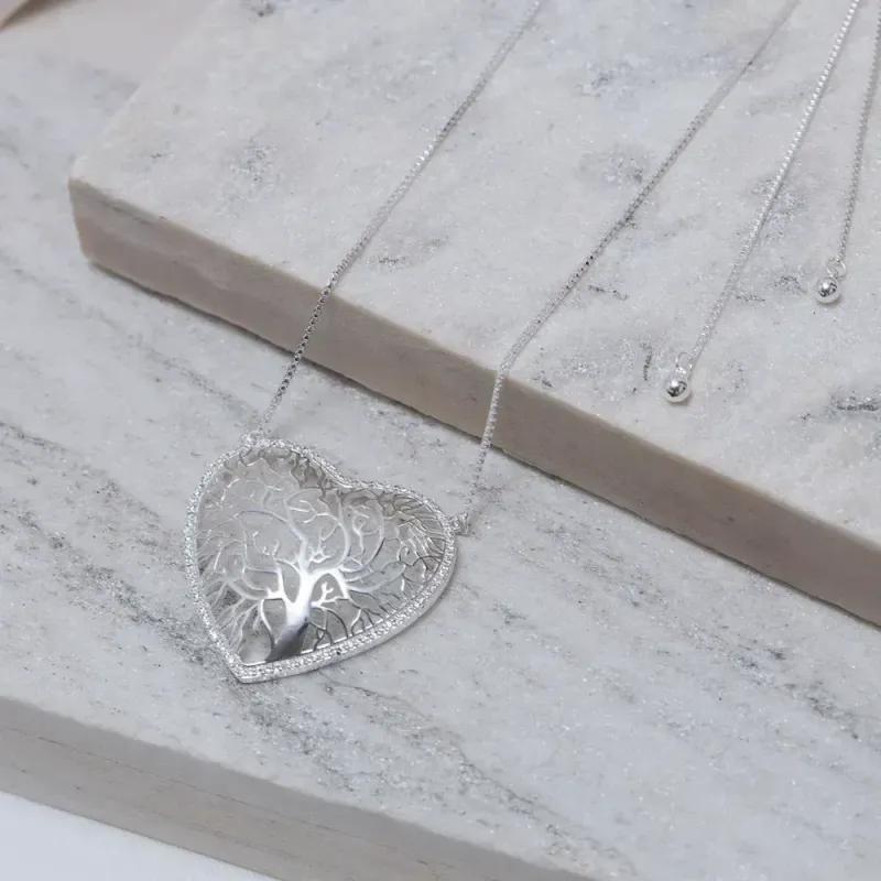 COLAR CORAÇÃO ÁRVORE DA VIDA REGULÁVEL BANHO PRATA