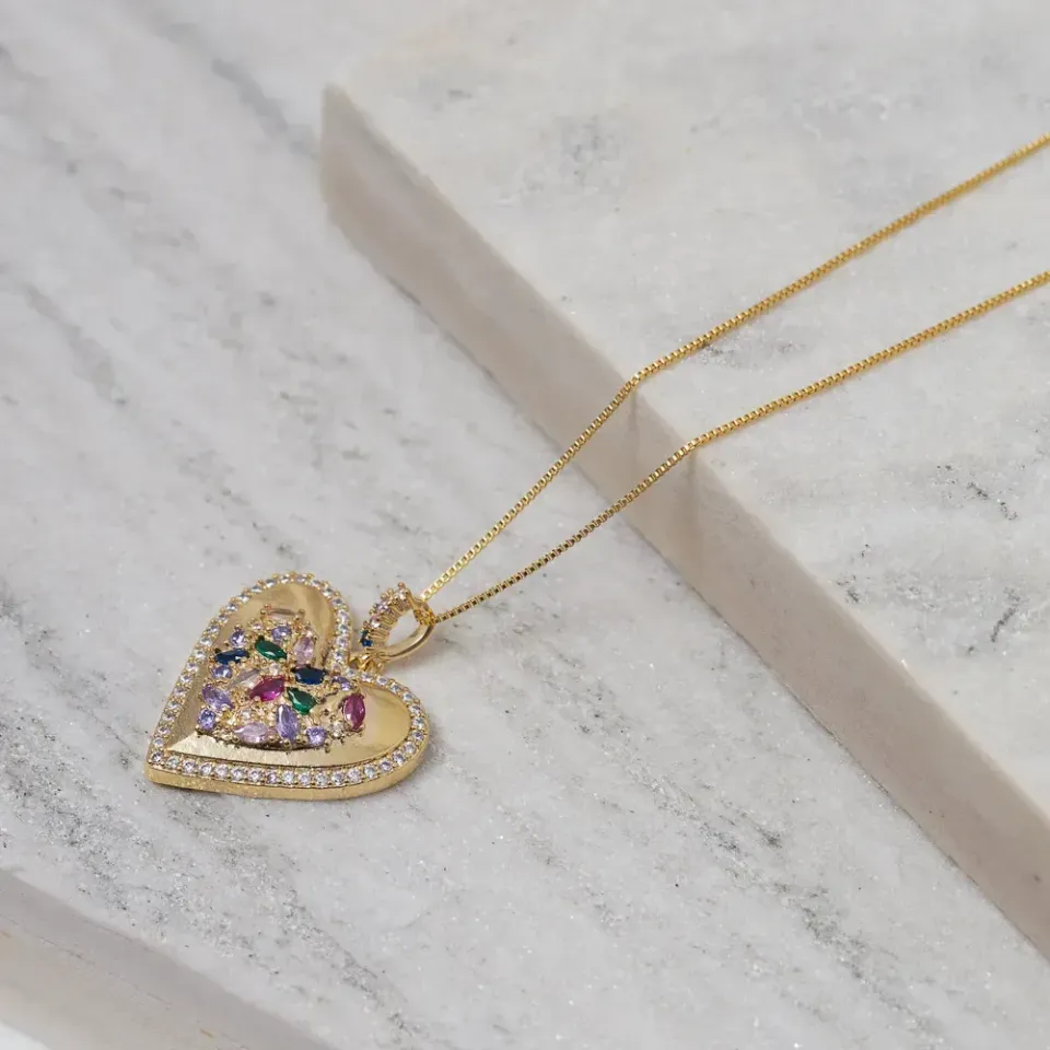 COLAR CORAÇÃO CRAVEJADO COM ZIRCÔNIAS CRISTAIS E COLORIDAS BANHO OURO 18K