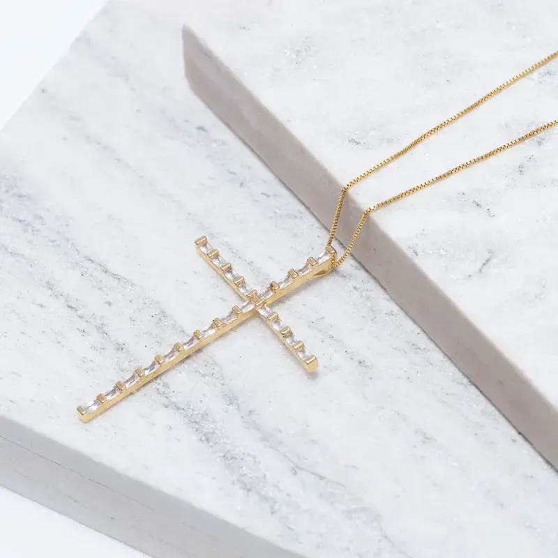 COLAR CRUZ COM PEDRAS COR CRISTAL BANHO OURO 18K