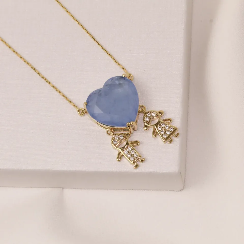 COLAR FILHOS CASAL COM CORAÇÃO AZUL BANHO OURO 18K