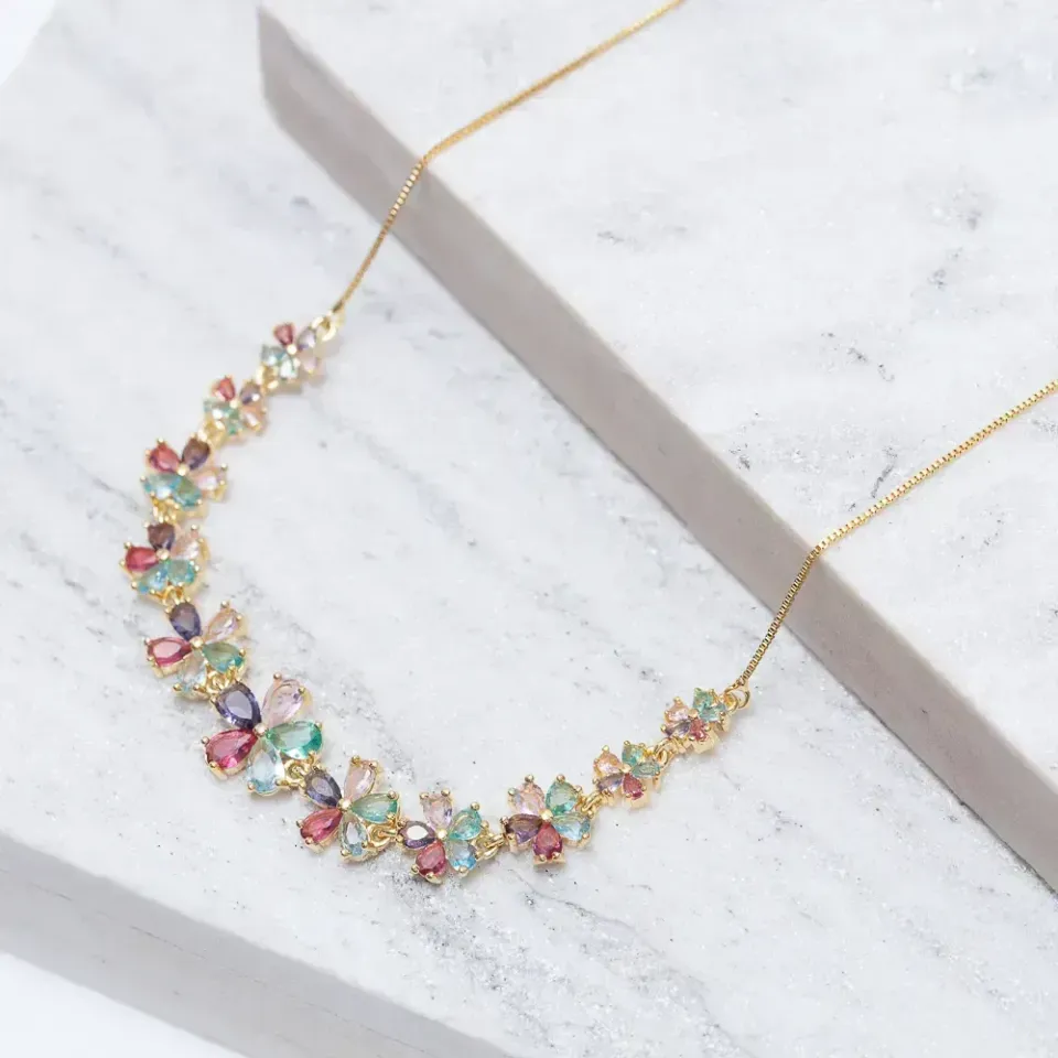 COLAR FLOR COM PEDRAS COLORIDAS BANHO OURO 18K