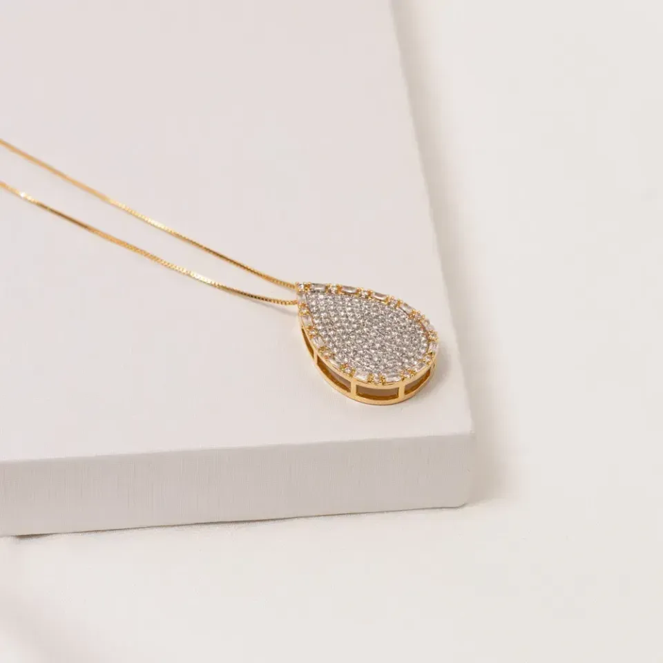 COLAR GOTA CRAVEJADA COM ZIRCÔNIAS CRISTAIS BANHO OURO 18K
