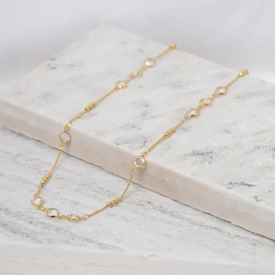 COLAR LONGO COM PEDRAS ZIRCÔNIAS CRISTAIS E BOLINHA BANHO OURO 18K