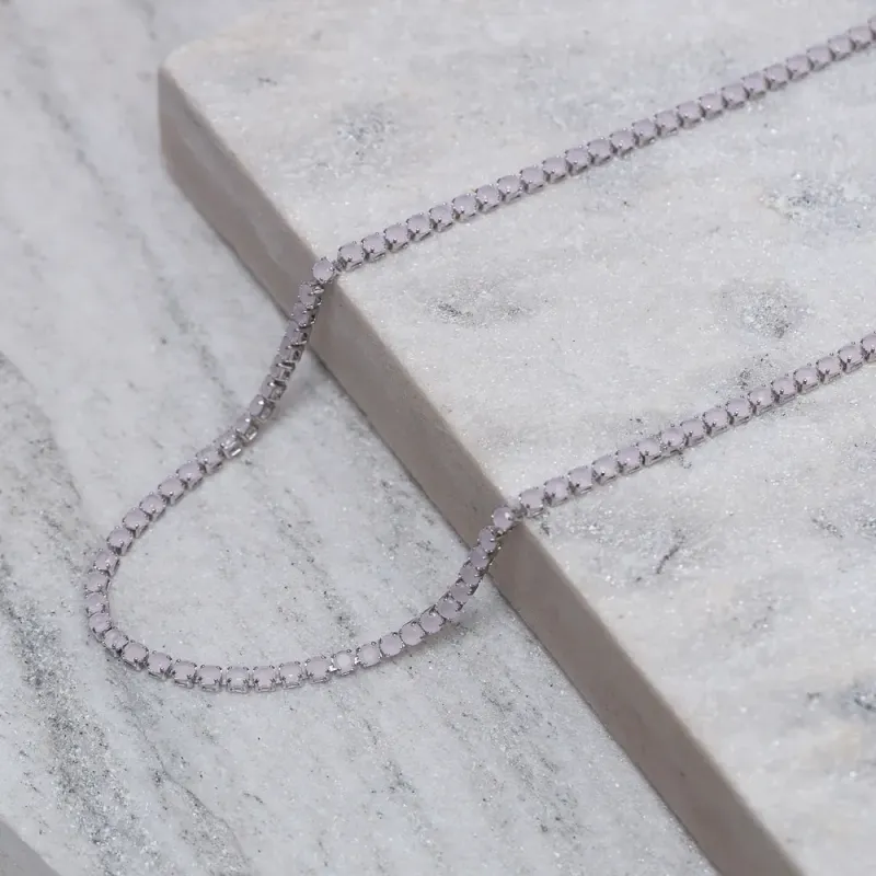 COLAR LONGO RIVIERA COM PEDRA ROSA CLARO BANHO RÓDIO BRANCO