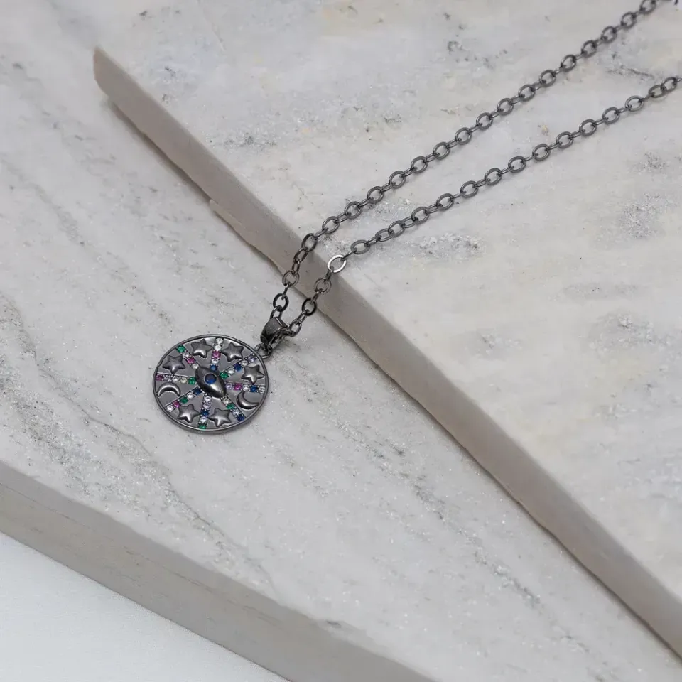 COLAR MEDALHA OLHO GREGO COM ZIRCÔNIAS COLORIDAS BANHO RÓDIO NEGRO