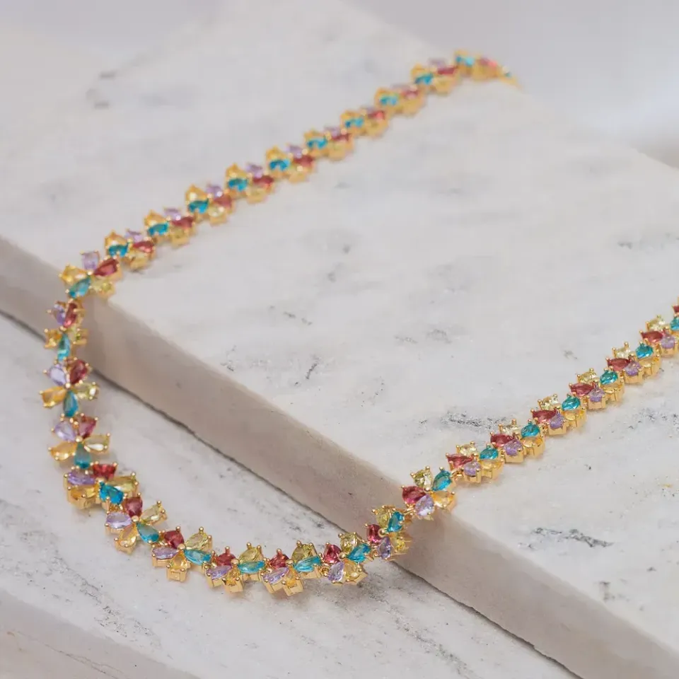 COLAR FLOR COM ZIRCÔNIAS COLORIDAS BANHO OURO 18K