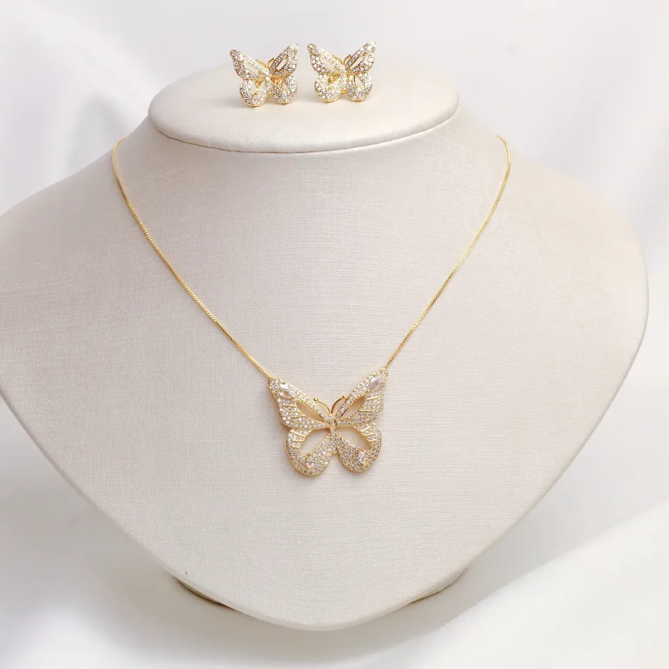 CONJUNTO BORBOLETA ZIRCÔNIA CRISTAL BANHO OURO 18K