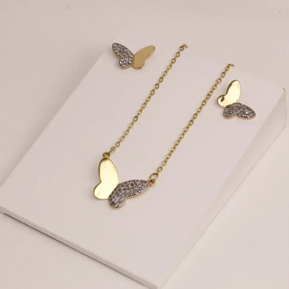 CONJUNTO BORBOLETA CRAVEJADA COM ZIRCÔNIAS CRISTAIS BANHO OURO 18K