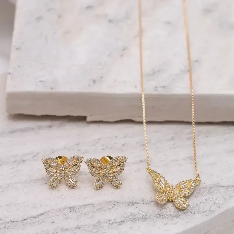 CONJUNTO BORBOLETA CRAVEJADA COM ZIRCÔNIAS CRISTAIS BANHO OURO 18K