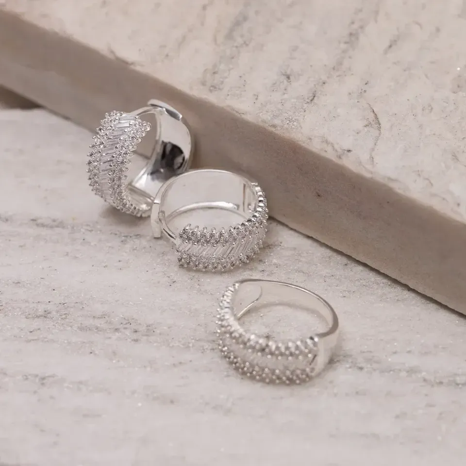 CONJUNTO BRINCO E ANEL CRAVEJADOS COM ZIRCÔNIAS CRISTAIS BANHO PRATA