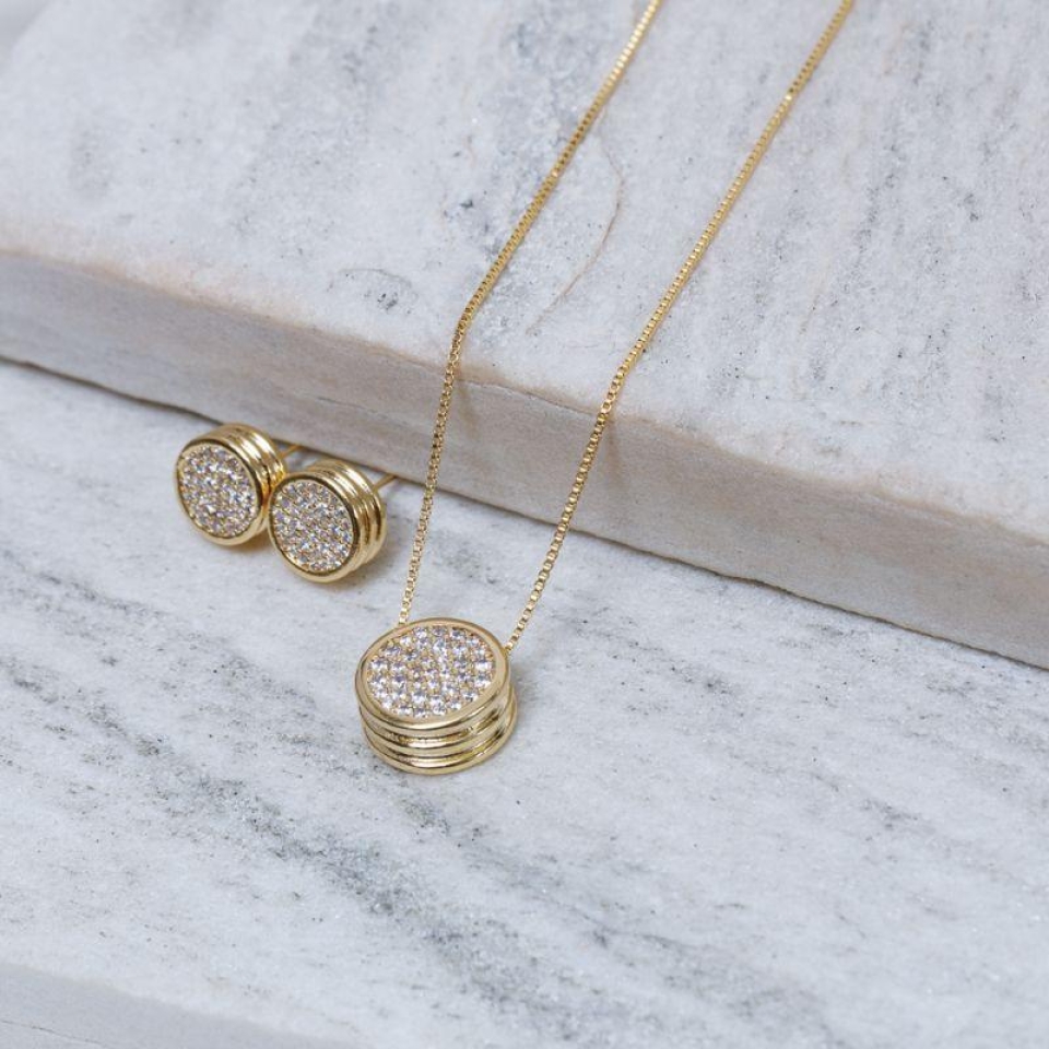 CONJUNTO CÍRCULO CRAVEJADO BANHO OURO 18K