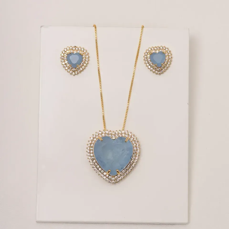 CONJUNTO CORAÇÃO COM ZIRCÔNIAS E PEDRA COR AZUL CLARO BANHO OURO 18K