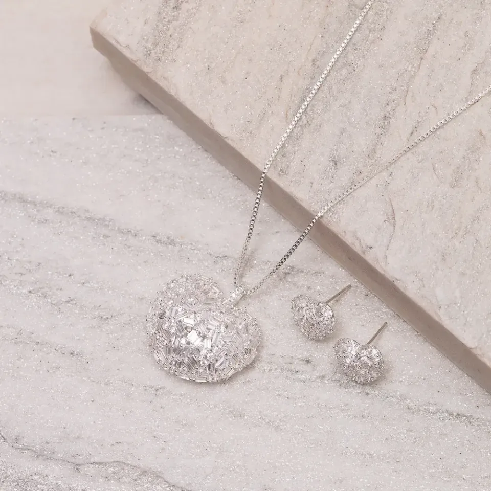 CONJUNTO CORAÇÃO CRAVEJADO COM ZIRCÔNIAS NAVETE CRISTAIS BANHO PRATA