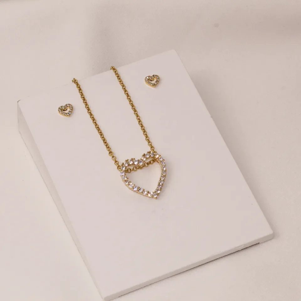 CONJUNTO CORAÇÃO COM ZIRCÔNIAS BANHO OURO 18K